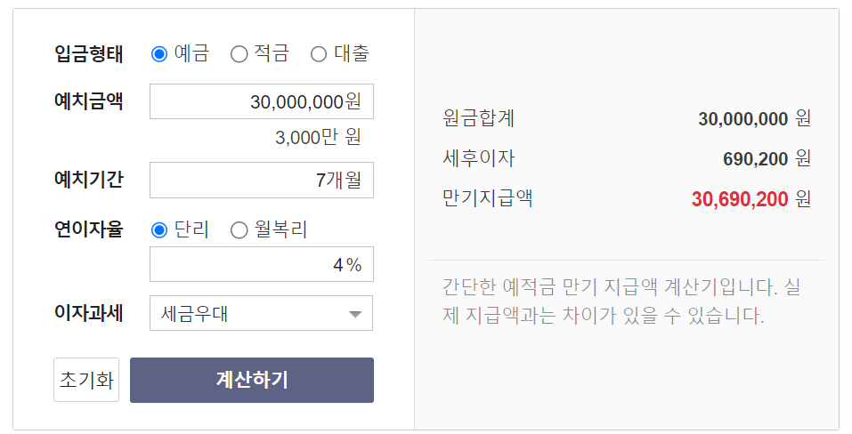 3천만원을 7개월 동안 연 4% 금리에 세금우대(1.4%) 로 가입한다면 세후 이자는 690,200원을 받을 수 있습니다.