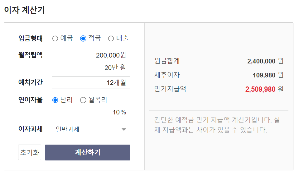 이자계산기로 만기이자가 얼마나 나올지 계산해보았습니다.
