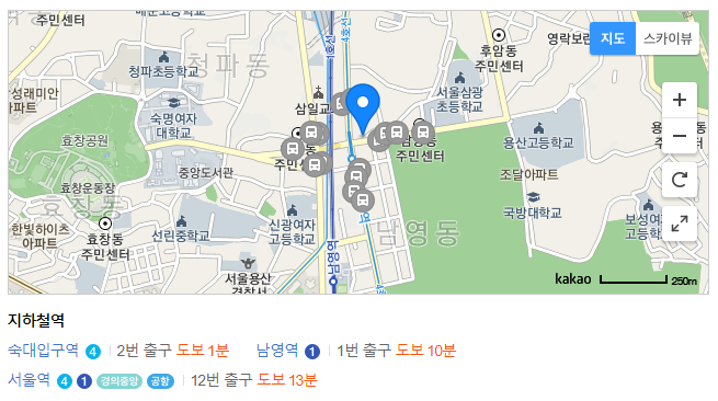 숙대입구역 2번 출구 앞에 위치하고