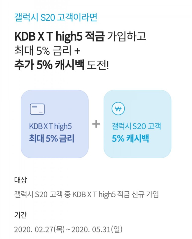 가입 대상 : 갤럭시 S20 고객중 KDB X T high5