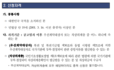가. 공통사항 ㅇ 대한민국 국적을 소지하신 분 ㅇ 민법상 만 19세 (2001. 3. 16. 이전 출생자) 이상인 분 나. 자격기준 ㅇ 공고일자 이후, 우선계약대상자 또는 차상위계층 대상자 중 어느 하나에 속하는 분 ㅇ (우선계약대상자) 복권 및 복권기금법 제30조와 같은법 시행령 제21조에 의한 우선계약대상자로국가기관에 등록·결정되어 관련 증빙서류를 발급받을 수 있는 분 ㅇ (차상위계층대상자) 국민기초생활보장법 제2조제10호에 따라 관련 법령에 의한 국