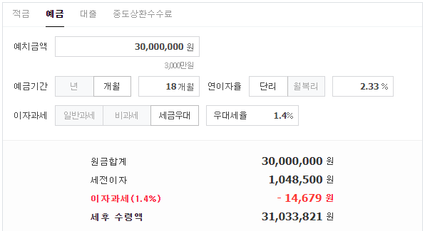 18개월 동안 3,000만원의 예금을 연 2.33%
