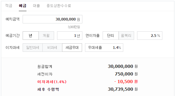 3000만원을 1년동안 2.5% 예금금리를 적용받아