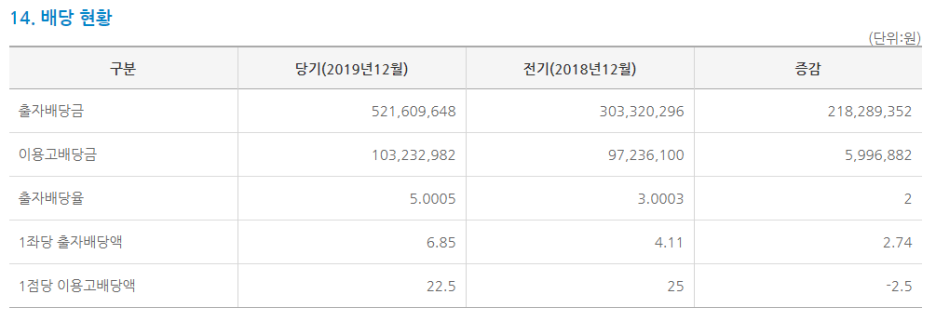2019년에 5%의 출자배당하였고