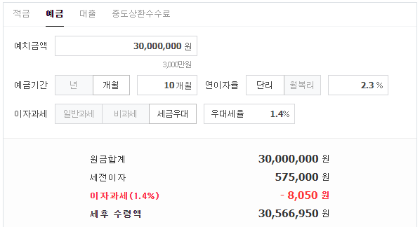 3,000만원을 10개월 동안 2.3% 금리를