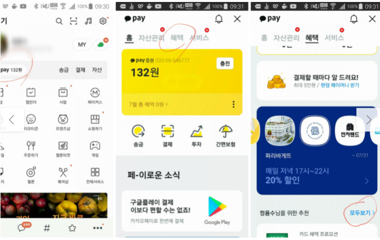 카카오페이에서 혜택 버튼을 누른 다음