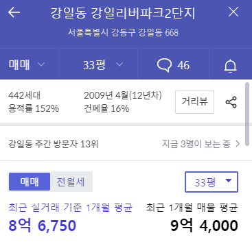 현재 9억 ~ 10억정도의 호가를 보여주고