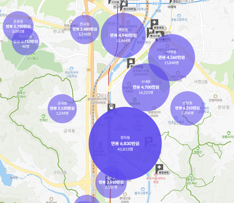 분당의 여러동의 평균 연봉을 살펴보면
