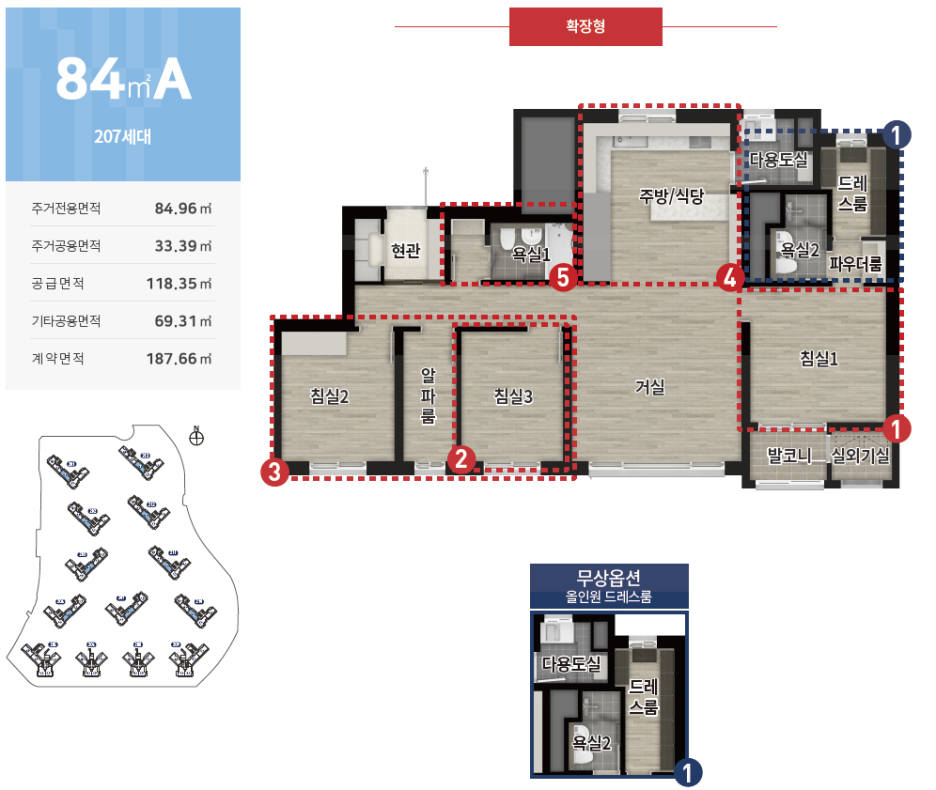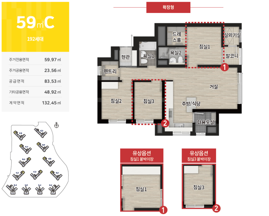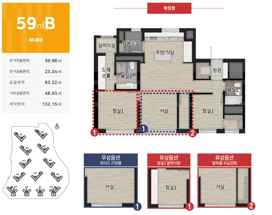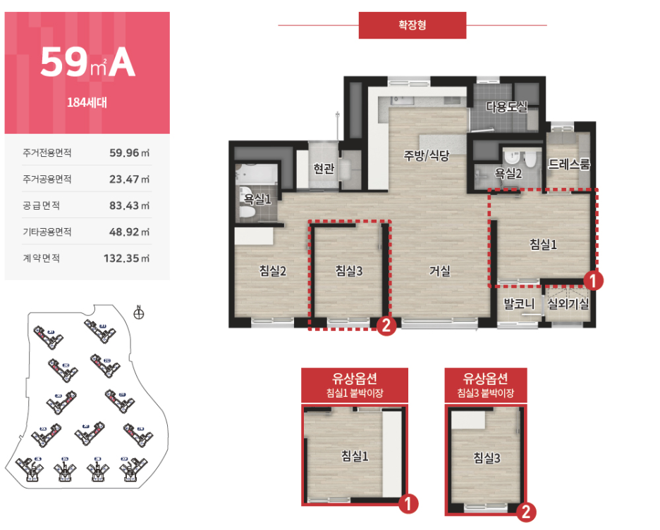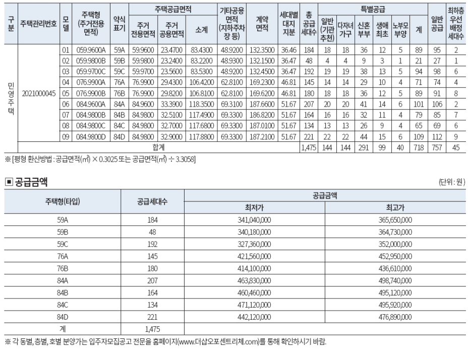 공급 면적 : 59m2, 74m2, 84m2
