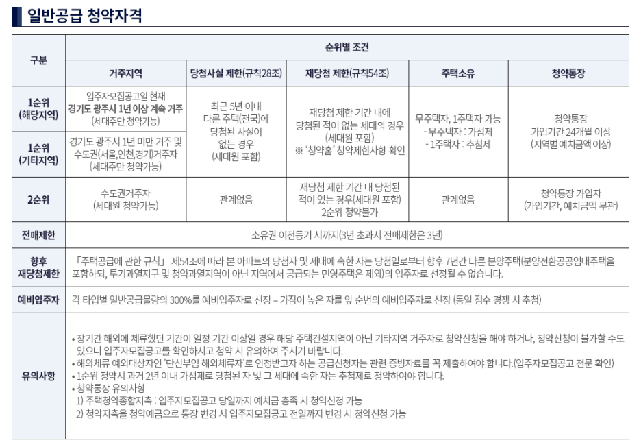 청약 1순위 : 광주시 거주 1년 이상 우선 선정
