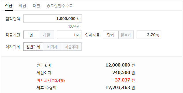 3.7% 정기적금에 일반 과세로 (15.4%)