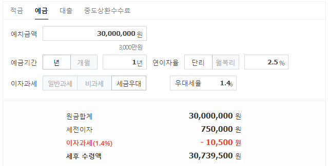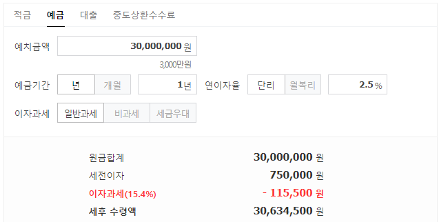 3천만원을 2.5% 적용받고 이지과세 (15.4%) 후