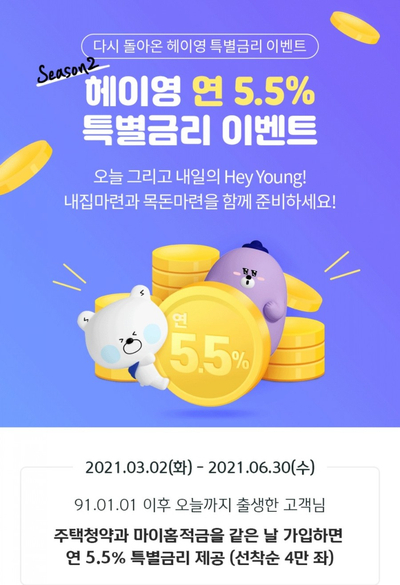 | 고양누리새마을금고 특판적금 1년 3.5% 2년 3.8% 고금리 3월 8일 판매 예정 (0) | 2021.03.07 |
