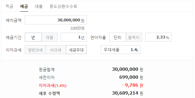 원금 3,000만 원을 12개월 동안 연 2.33%