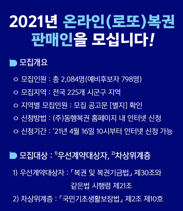 2021년 온라인(로또)복권 판매인을 아래와 같이 모집하오니 신청자격에 해당되시는 분들은 많은 신청 바랍니다.