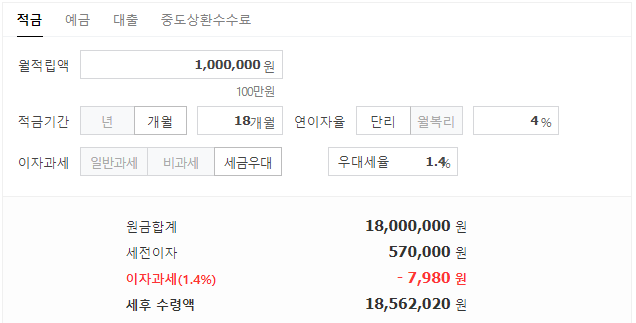 18개월 동안 월 100만 원씩 총 18번을 납입하고 연 4.0% 금리에 세금 우대(1.4%) 저율과세 혜택을 받게 되면 만기 이자는 562,020원을 받을 수 있습니다.