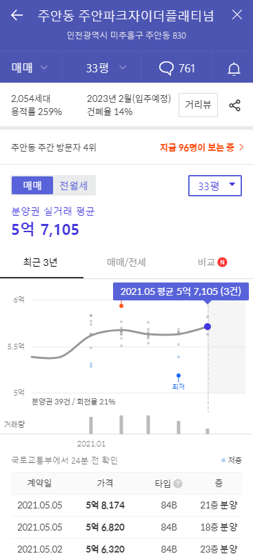 인근에 위치한 주안파크자이 84m2 분양권 실거래가