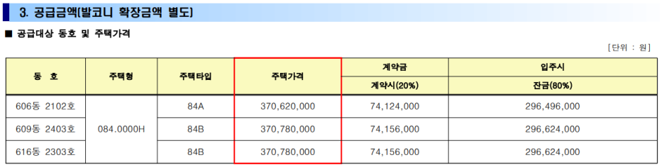 공급금액 분양가(발코니 확장금액별도)