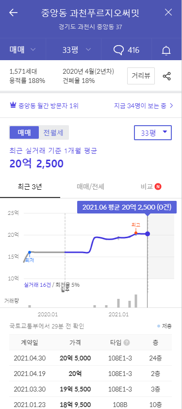 과천푸르지오써밋의 34평형 최근 실