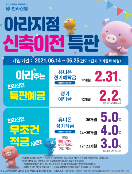 안녕하세요 ~ 저축도우미 시나브로입니다. 제주도를 업무구역으로 하는 한라신협에서 특판정기적금 3년 5% 특판정기예금 1년 2.31% 두가지 특판 상품을 신협온뱅크앱을 통해서 지점을 방문하지