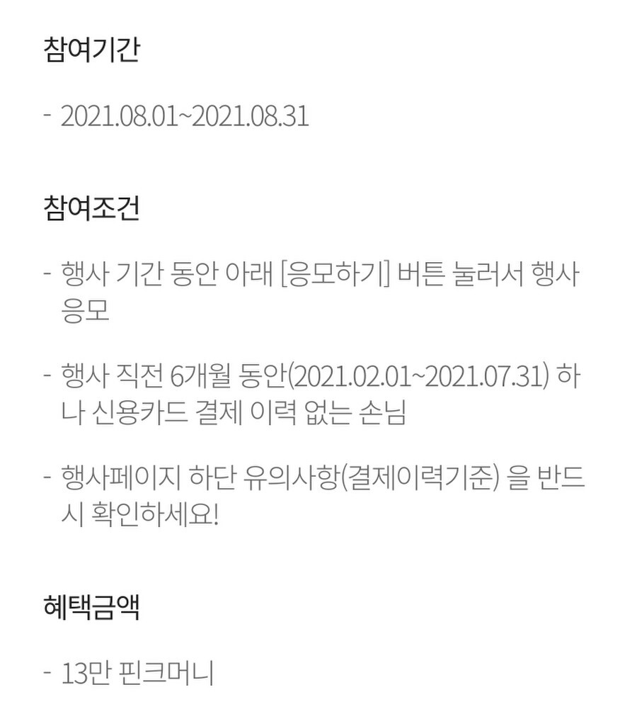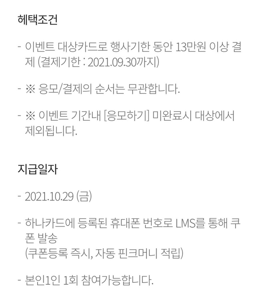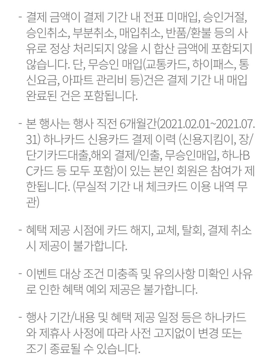 본 행사는 행사 직전 6개월간 (2021.02.01 ~ 2021.07.31) 하나카드 신용카드 결제 이력(신용지킴이, 장/단기카드대출, 해외 결제/인출, 무승인매일, 하나BC카드 등 모두 포함) 이 있는 본인 회원은 참여가 제한됩니다. (무실적 기간내 체크카드 이용 내역 무관)