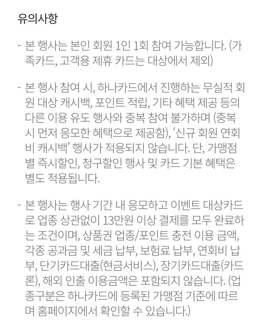 본 행사는 행사 기간 내 응모하고 이벤트 대상 카드로 업종 상관 없이 13만원 이상 결제를 모두 완료하는 조건이며 상품권 업종/포인트 충전 이용금액, 각종 공과금 및 세금 납부, 보험료 납부, 연회비 납부, 단기카드대출, 장기카드대출, 해외 인출 이용금액은 포함되지 않습니다.(업종 구분은 하나카드의 등록된 가맹점 기준에 따라며 홈페이지에서 확인할 수 있습니다.)