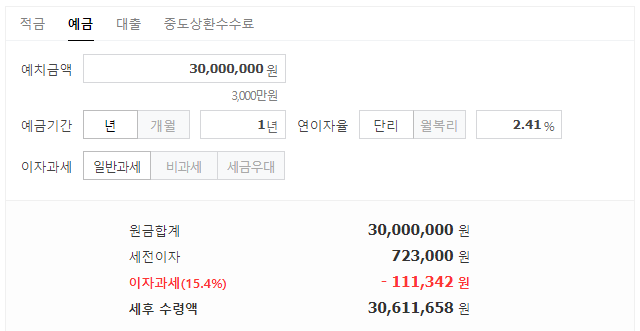 3천만원을 1년동안 예치하고 2.41%의 금리를 일반과세로 가입한다면 만기이자는 611,658원을 받을 수 있습니다.