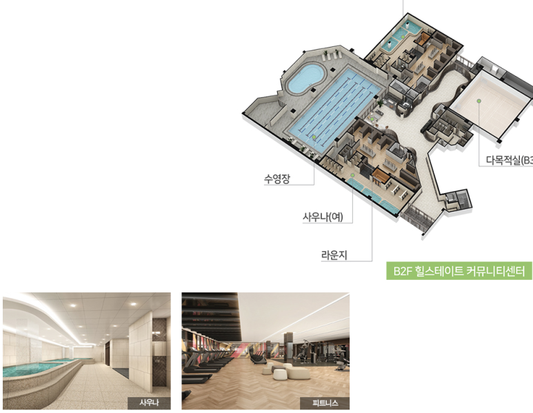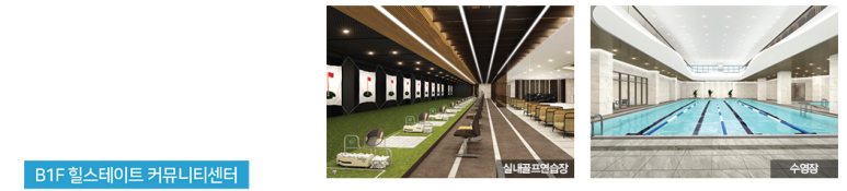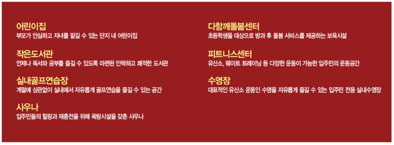 커뮤니티센터에는 어린이집, 다함께 돌봄센터, 작은도서관, 피트니스센터, 실내골프연습장, 사우나, 수영장이 있습니다.