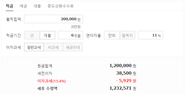 한달에 불입할 수 있는 최대 한도인 월 20만원씩 6개월동안 가입하면 만기시에 받을 수 있는 만기이자는 세후 32,571원을 받을 수 있습니다.