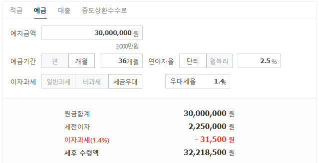3천만원을 36개월동안 예치하고 연 2.5% 금리에 세금우대/저율과세(1.4%) 혜택까지 적용 받는다면 만기이자는 2,218,500원을 받을 수 있습니다.