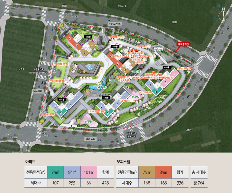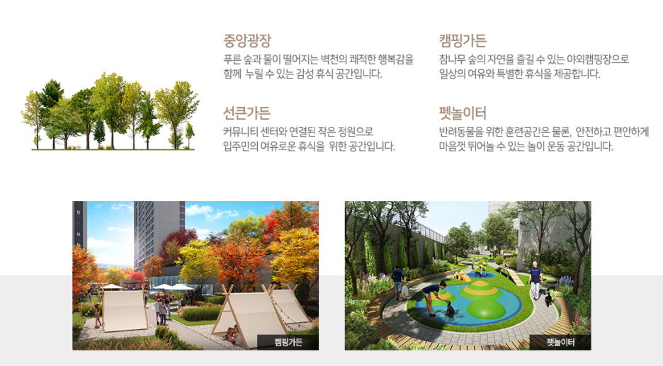 주상복합아파트라서 단지 규모는 작지만 중앙광장, 캠핑가든, 선큰가든, 펫놀이터까지 갖추고 있습니다.