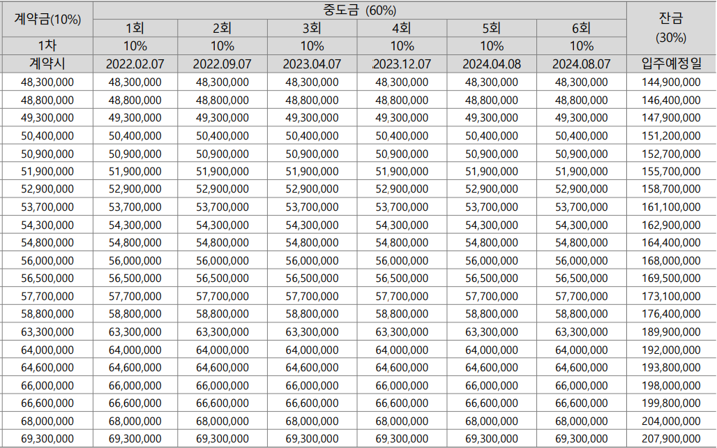 조정대상지역에 속해있기때문에 중도금 대출은 최대 50%까지만 가능합니다.