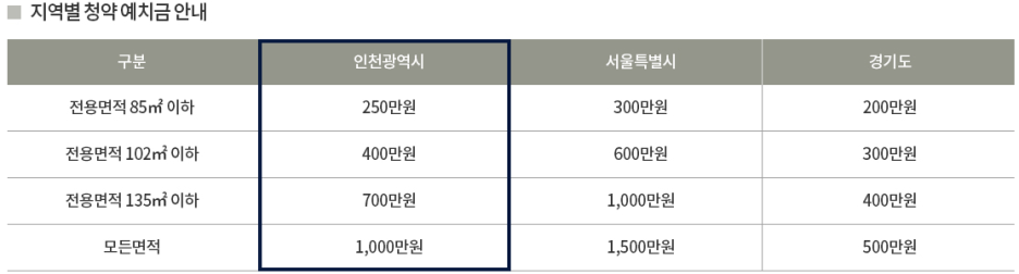 인천광역시에 거주한다고 가정하면 청약 통장에 400만원 이상 예치되어 있다면 전평형 모든 타입에 청약 신청이 가능합니다.