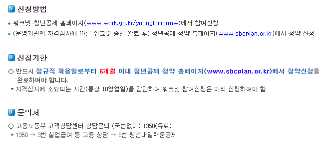 반드시 정규직 채용일로부터 6개월 이내 청년공제 홈페이지 (www.sbcplan.or.kr) 에서 청약 신청을 완료하여야 합니다.