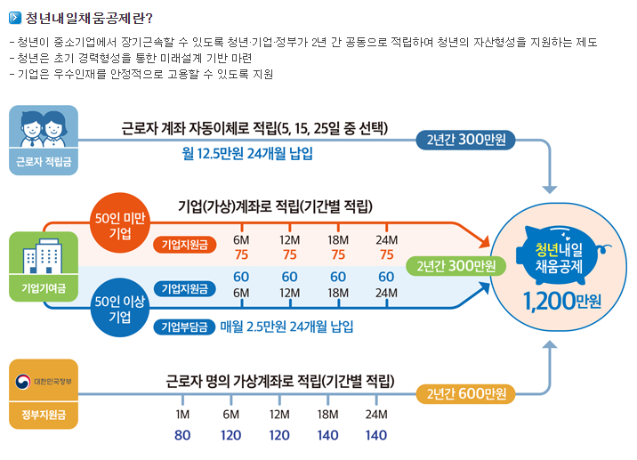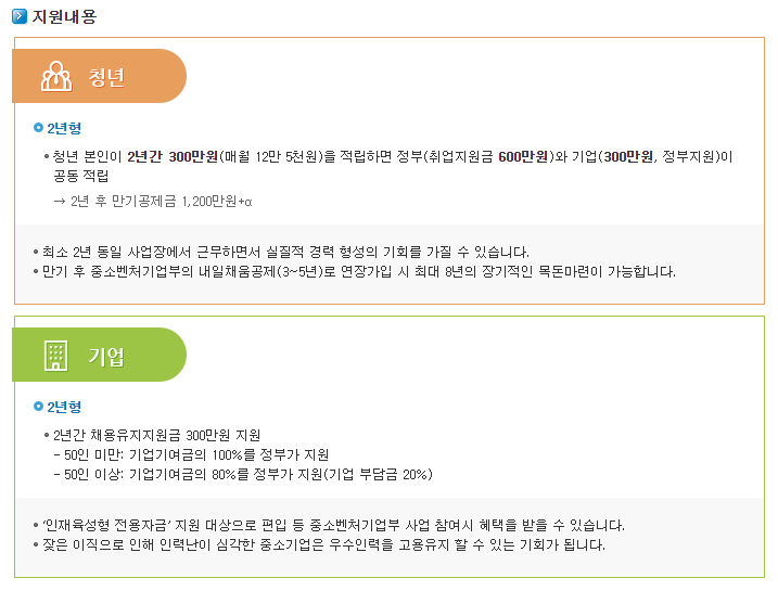 청년 본인이 2년간 300만원 (매월 12만 5천원) 을 적립하면 정부 (취업지원금 600만원) 와 기업 (300만원, 정부지원) 이 공동 적립