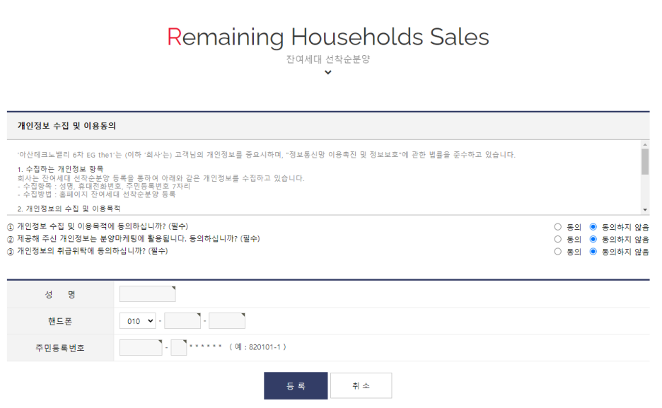 성명, 핸드폰, 주민등록번호만 입력하면 잔여세대 선착순 분양을 등록할 수 있습니다.