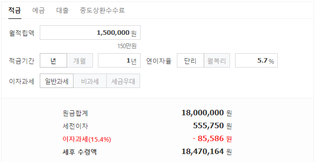 월 150만원씩 12개월 동안 꾸준히 납입하고 연 5.7% 금리를 적용 받고 일반과세로 받는다면 만기이자 470,164원을 받을 수 있습니다.