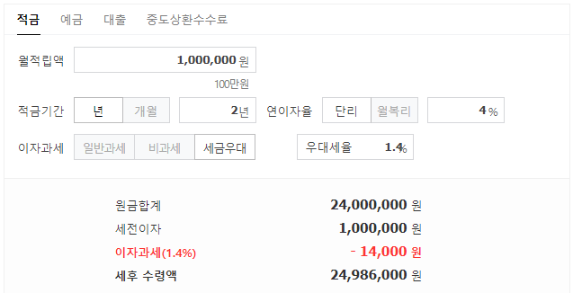 월 100만원씩 2년동안 불입하고 연 4%의 금리를 적용하고 세금우대 1.4% 혜택까지 받을 수 있다면 만기이자는 986,000원을 받을 수 있습니다.