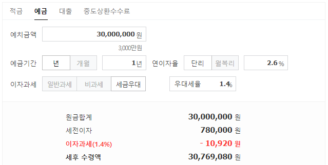 3천만원을 12개월동안 예치하고 연 2.6% 적용받고 이자과세(1.4%) 적용 받는다면 만기이자는 769,080원을 받을 수 있습니다.