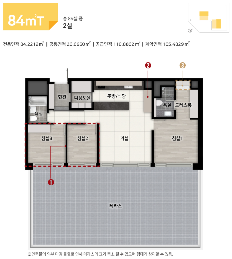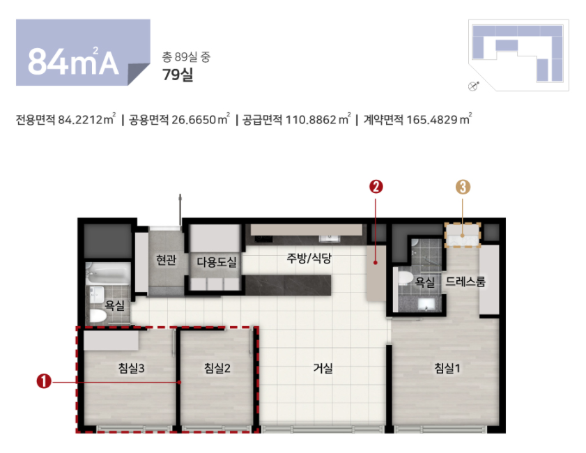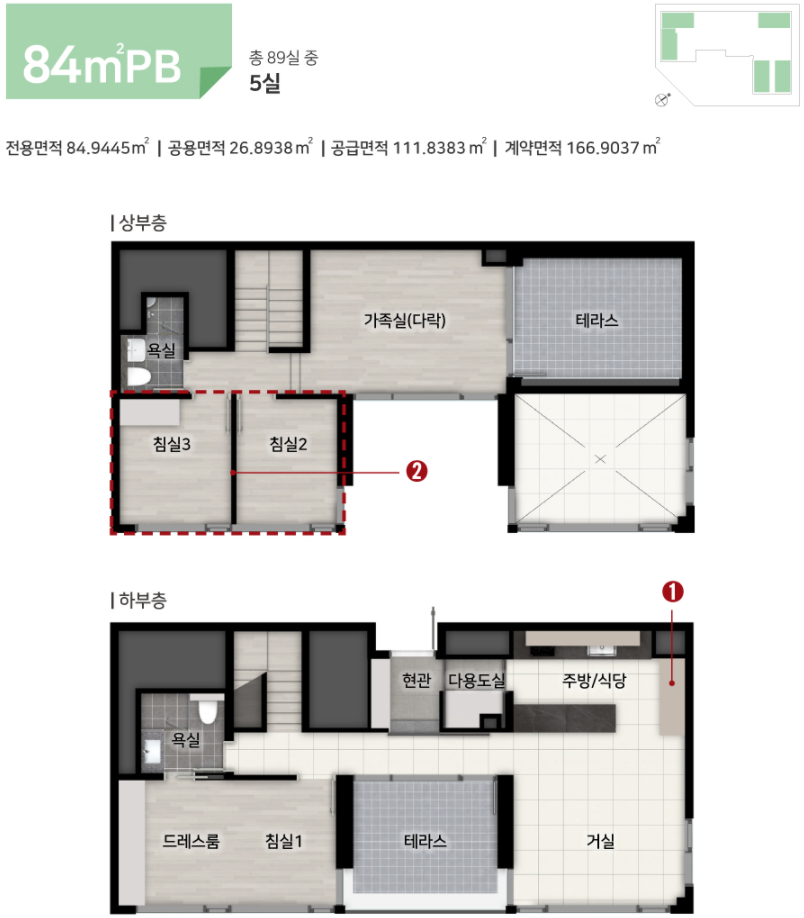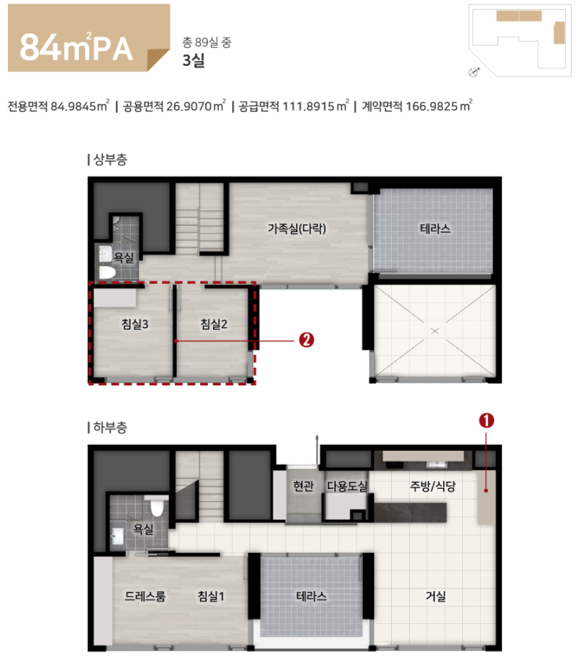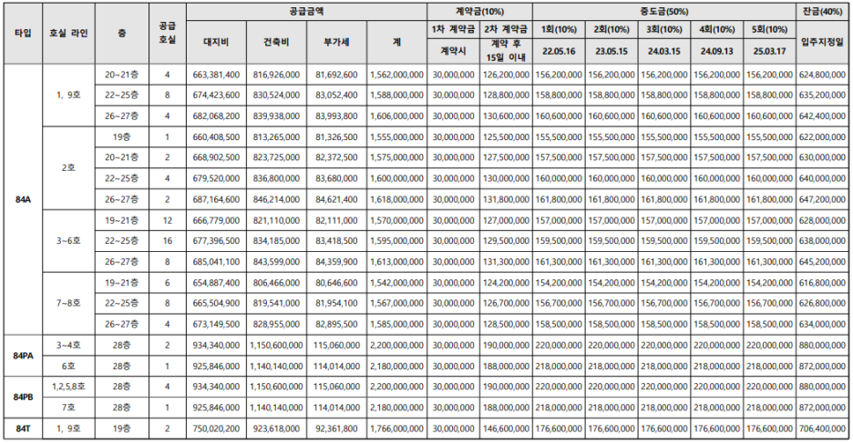 84PA형과 84PB는 복층형 구조인데 주변 신축 아파트의 34평형 시세에 육박하는 22억에 책정되었습니다.