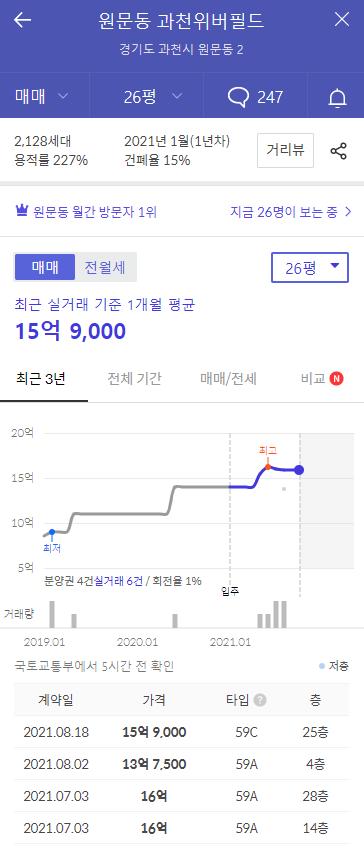 이번 과천청사역오피스텔의 분양가가 얼마나 높은지 비교해보기 위해서 인근에 위치한 과천위버필드 아파트의 26평 실거래가를 검색해보았습니다.