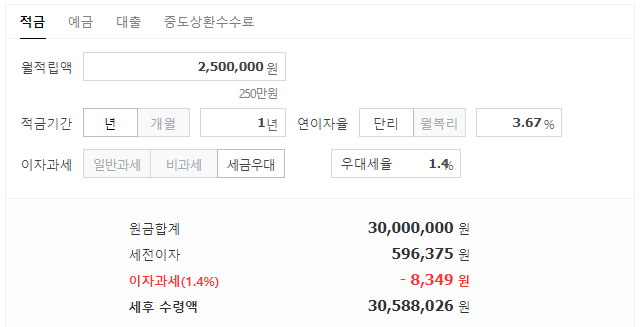 1년 동안 매달 250만원씩 불입하고 연 3.67% 금리에 세금우대/저율과세(1.4%) 혜택까지 받을 수 있다면 만기이자는 588,026원을 받을 수 있습니다.