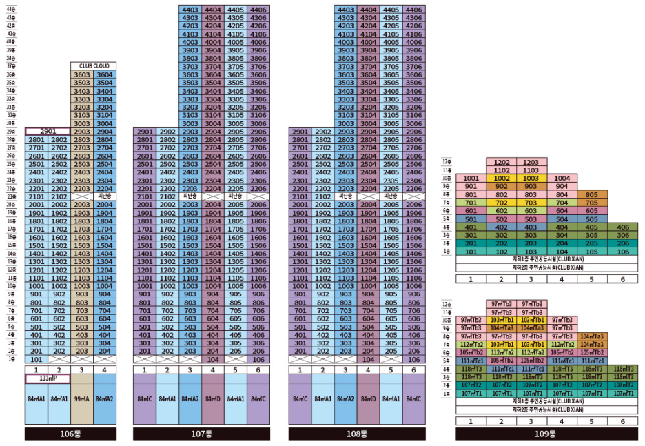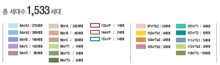 지하 2층 지상 1층 ~ 44층 / 주동 9개동 / 84~99㎡ / 99㎡T / 97~118㎡T / 133~ 151㎡P
