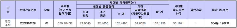 무순위 사후 접수 1세대는 79B 타입 604동 1902호입니다. 총 25층 아파트에 19층이라서 로열층으로 볼 수 있을 것 같습니다.