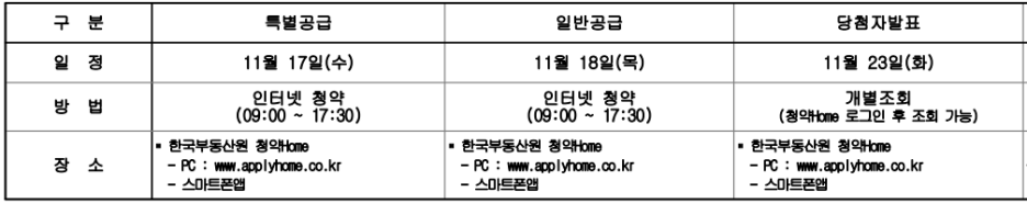 무순위 사후접수 1세대는 11월 17일 청약 신청이 가능하며 계약취소세대 특별공급 신청일은 11월 17일 일반공급 1세대는 11월 18일에 각각 청약홈을 통해서 청약신청할 수 있습니다.
