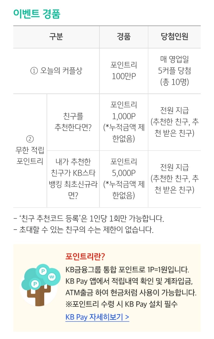KB스타뱅킹에 신규로 가입하셨다면 추천한 사람과 추천받은 사람 모두 5,000포인트리를 받게되고 기존 가입자라면 1,000포인트리를 받을 수 있습니다.