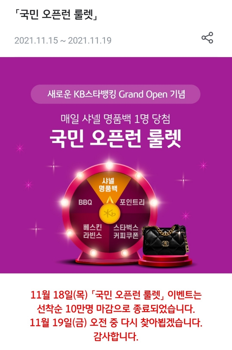 11월 19일 (금) 오전중에 국민 오픈런 룰렛 이벤트가 다시 열리니 확인하시고 참여하세요 ^^