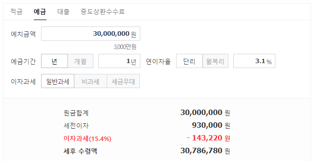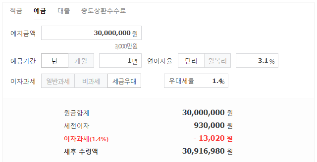 3,000만원을 12개월 동안 예치하고 연 3.1% 금리에 세금우대/저율과세(1.4%)로 적용 받는다면 만기이자는 916,980원을 받을 수 있습니다.