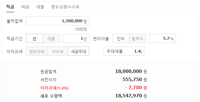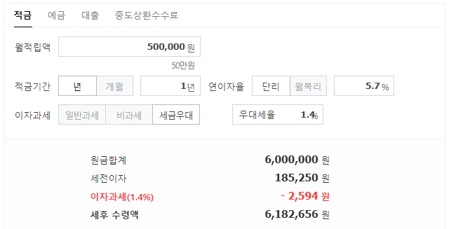 월 50만원씩 12개월동안 불입하고 연 5.7% 금리에 세금우대/저율과세로 가입한다면 만기이자는 182,656원을 받을 수 있습니다.