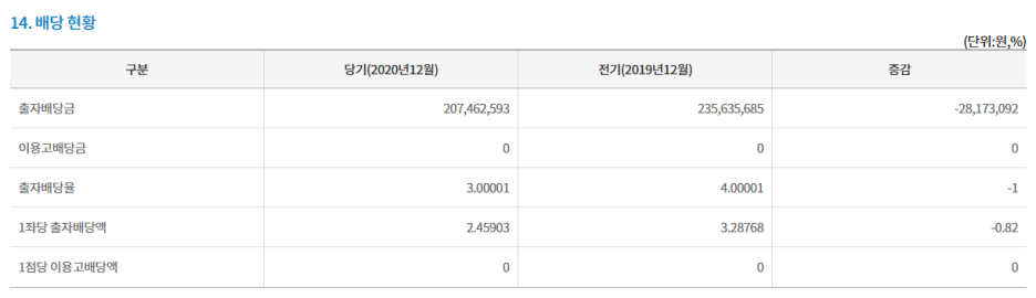 3.0% 출자배당을 하였고 낮은 배당률은 아닌 것 같습니다.